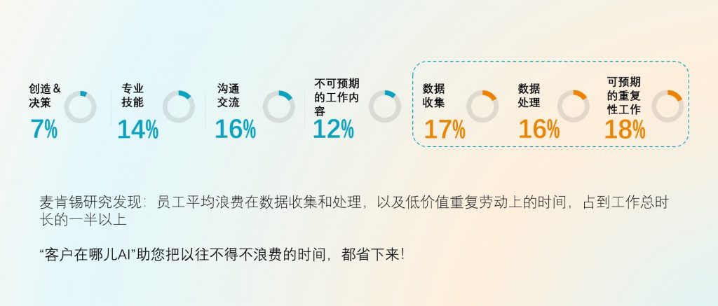 正是因为市场营销人员和销售人员日常收集与处理的数据大多集中在这三大方面,并且,无论是日报、周报、月报还是其他任何营销用材料,都会用到这些数据,所以,客户在哪儿AI才能够精准的满足这些需求,帮助员工节省那占总工作时长51%的时间,从而更多的专注于高价值的创造性工作。